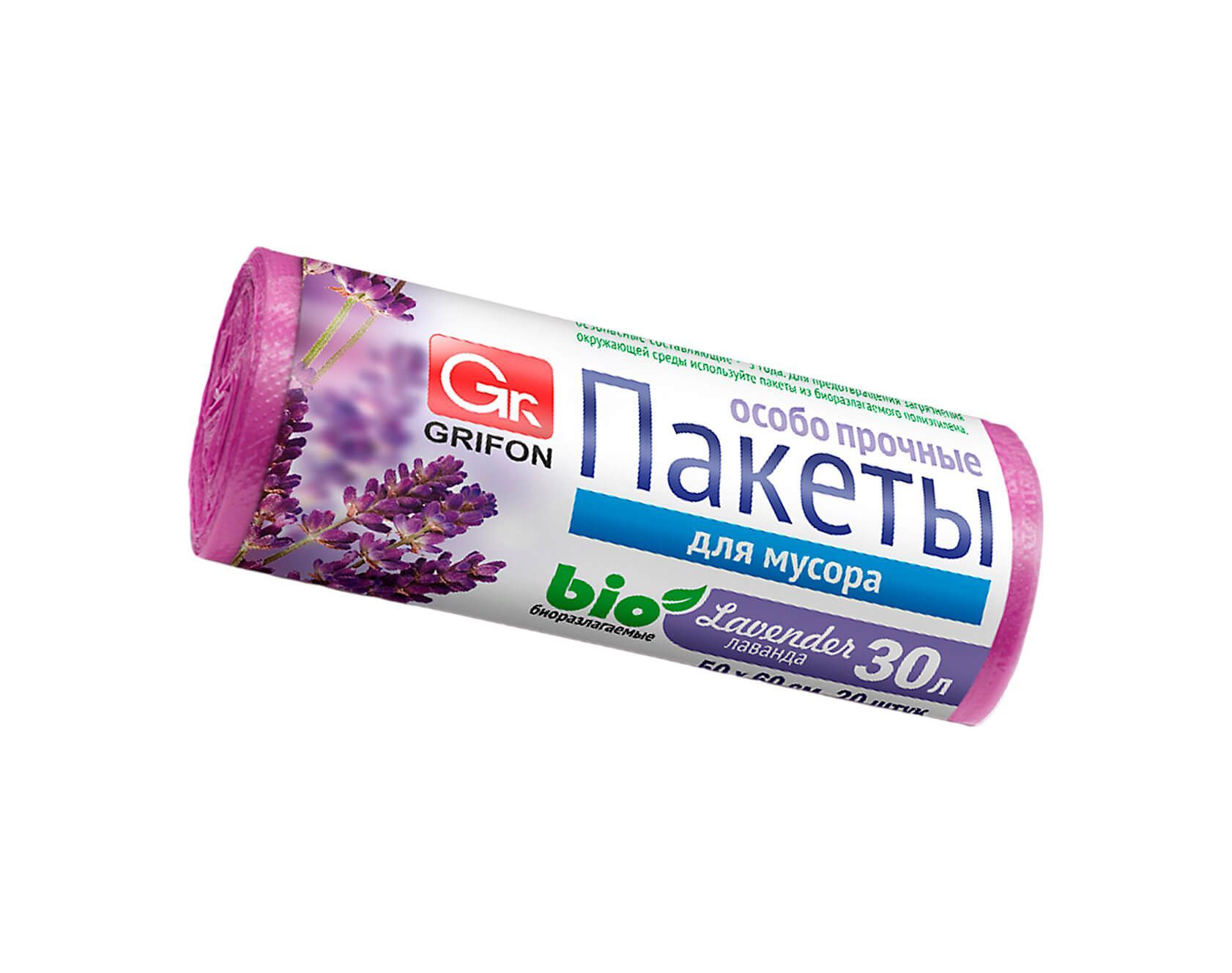 Мешки для мусора 30 л, ароматизированные, Лаванда, сиреневые, в рулоне 20 шт., ПНД, 9 мкм, 560х530 мм, GRIFON Aroma, 101-020 La